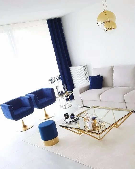If you prefer to keep the main sofa neutral such as white off-white cream or ivory then focus on the single-seater sofa s. Central to the room an irresistible royal blue velvet sofa draws the eye. Make A Statement With Blue Sofa Chairs And White Curtains.